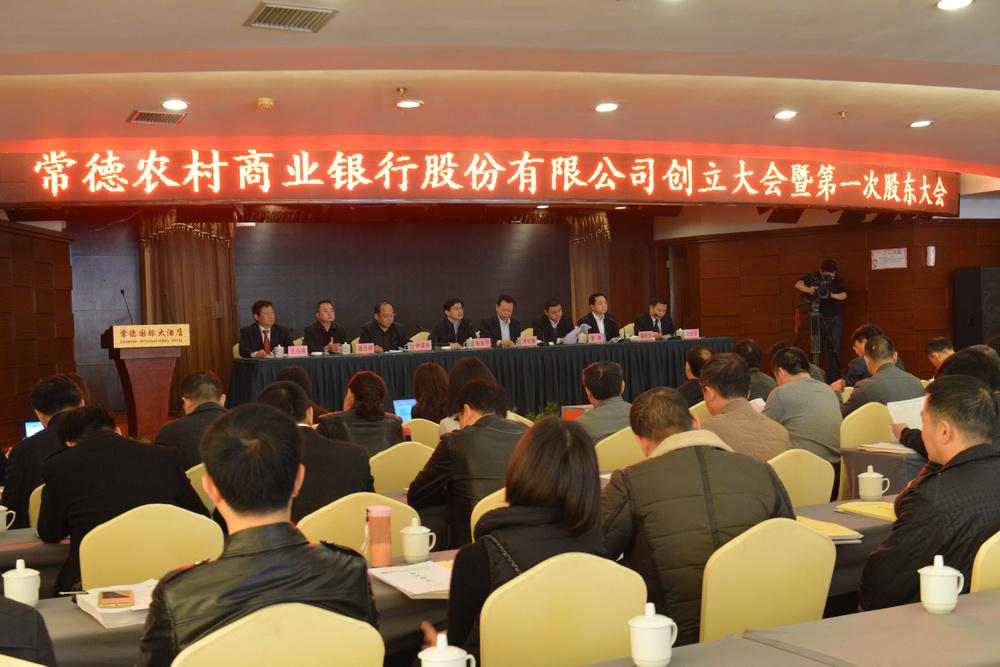 会上,常德银监分局副局长聂新华宣读了中国银监会《关于筹建常德农村商业银行股份有限公司的批复》,湖南省农村信用社联合社常德办事处副主任高仕贤作了常德农村商业银行股份有限公司筹建工作报告,湖南省农村信用社联合社常德办事处主任王小洪宣读了《关于同意常德农村商业银行股份有限公司董、监事候选人的批复》。在律师的全程见证下,大会以举手表决的方式一致通过大会提名的唱票人、计票人、监票人。以记名投票方式表决通过了常德农商银行筹建工作报告、公司章程、股东大会议事规则、未来三年经营方针和业务发展规划、支持“三农”发展和明确今后三年农业贷款比例的意见等11项议案,选举产生了常德农商银行股份有限公司第一届董事会股权董事和第一届监事会股权监事。