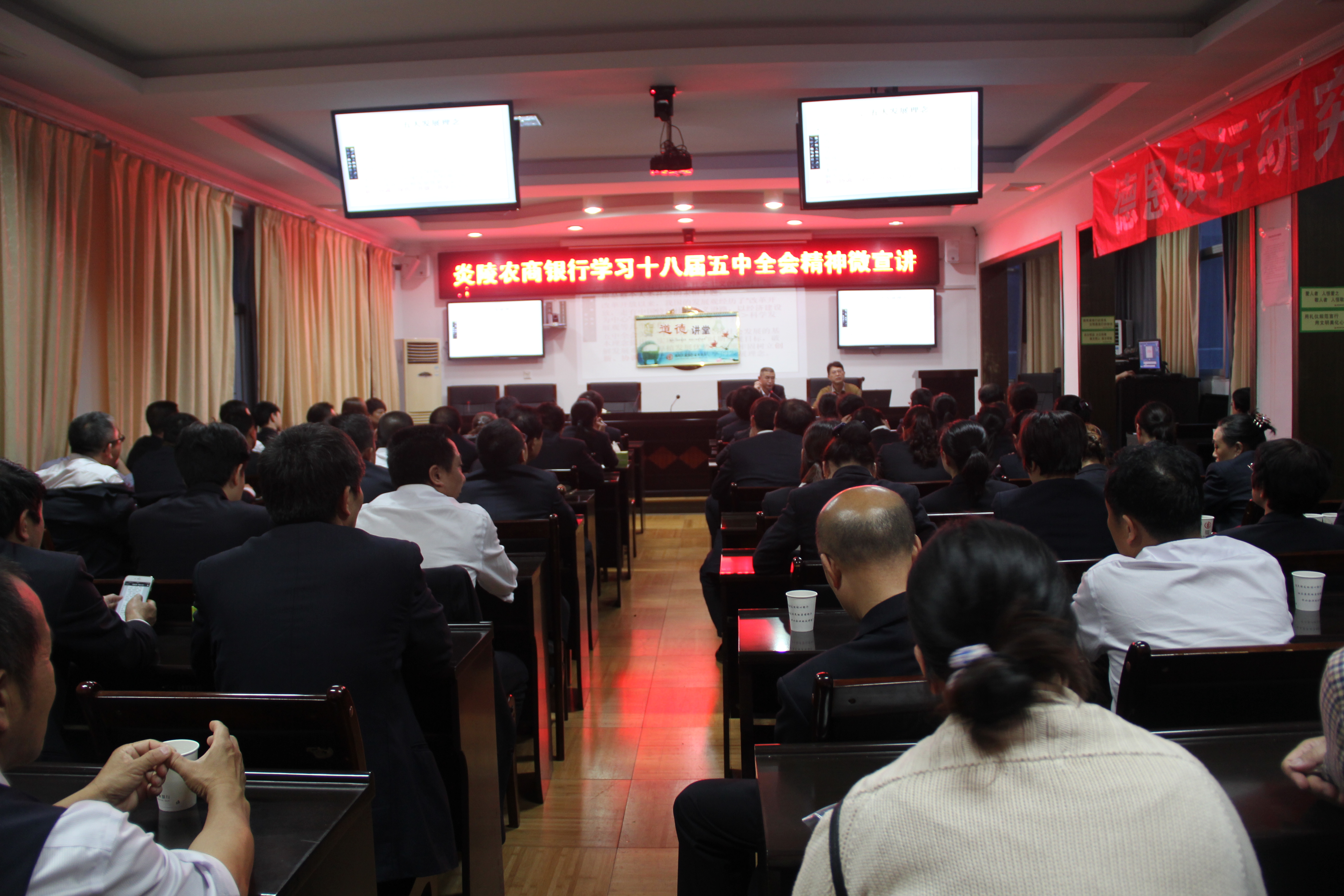 4月21日晚上,炎陵农商银行邀请县委宣讲团到总行开展学习“十八届五中全会精神微宣讲”活动,通过视频会议系统,该行行领导、机关部室及下辖23个营业网点共260多名员工参加了学习。