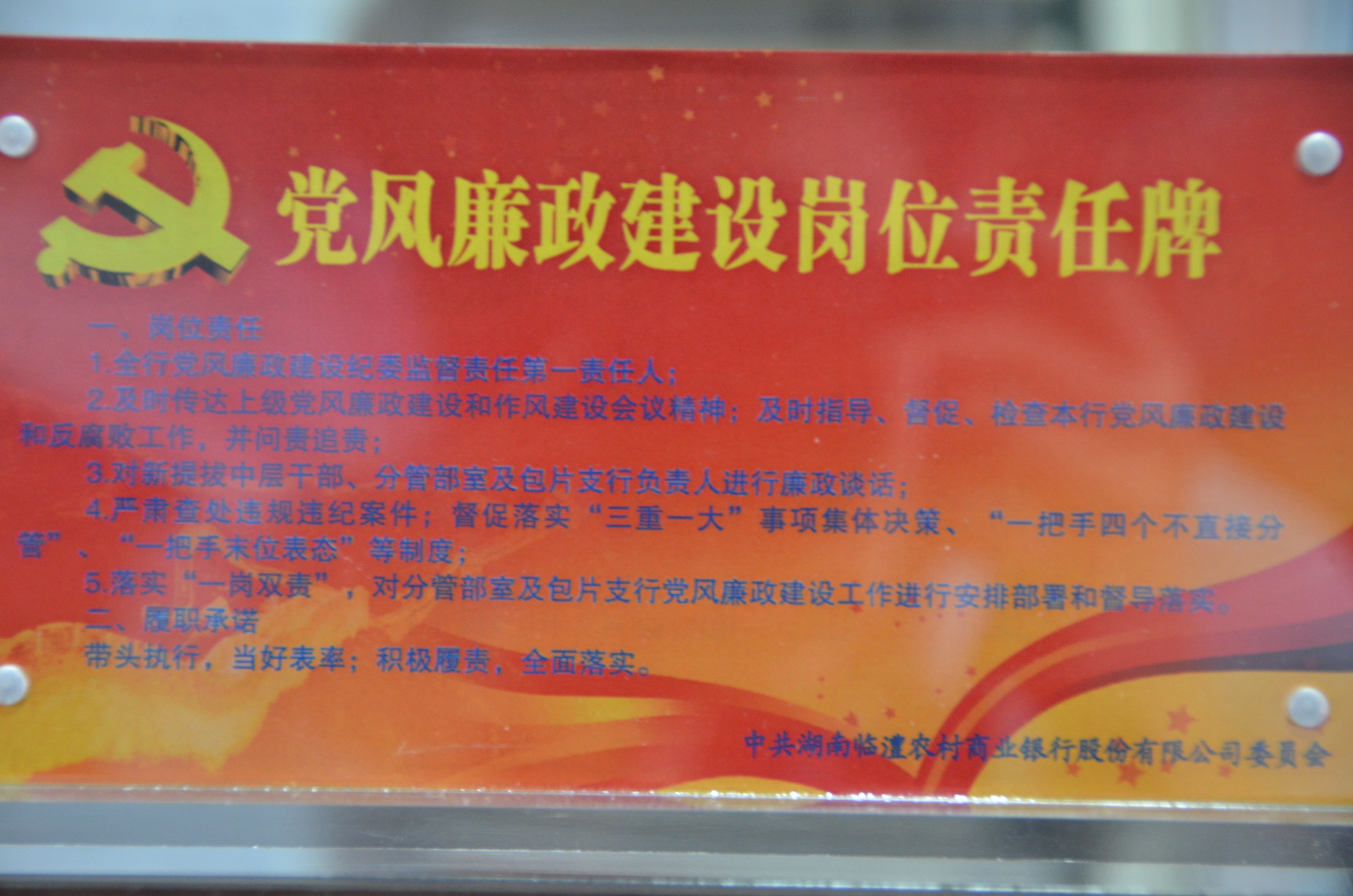 二是岗位责任“亮牌制”。对该行党委班子成员、各支行行长、部室负责人党风廉政建设岗位责任进行了“亮牌”,于5月27日在其办公桌上摆放党风廉政建设岗位责任牌。责任牌上列明了责任人姓名、岗位职务、岗位责任清单及本人履责承诺等内容。