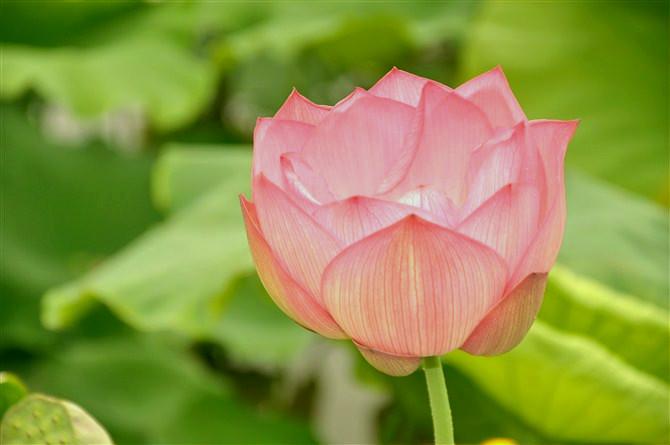 粉白莲花亭亭立于碧叶清水之间,莲叶轻舞,莲花轻曳,晨风拂面,清香曼延。碧湖清莲,粉苞绿盘,是一道天然的视觉佳宴,而那些或大或小的莲池莲湖都似一个个与外界隔绝的静穆的王国。这清静的王国里,只有清澄之水,清秀之叶,清香之花,外界的喧嚣与繁华只能默然退在湖界之外,如同尘世凡夫在佛祖面前只能静观静思,丝毫不能影响圣徒高人悟道清修。《本草纲目》中写莲花“夫莲生卑污,而洁白自若;南柔而实坚,居下而有节。孔窍玲珑,纱纶内隐,生于嫩弱,而发为茎叶花实;又复生芽,以续生生之脉。四时可食,令人心欢,可谓灵根矣!”莲之高洁,莲之玲珑,可见一斑,莫不如一颗至纯至上之慧心。