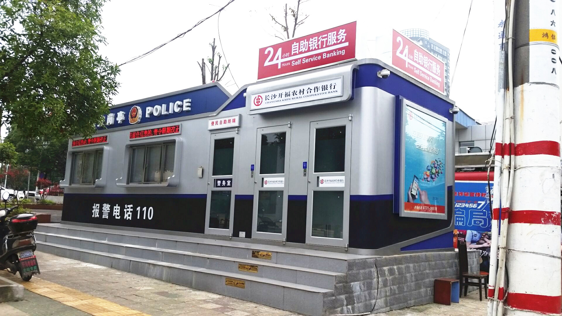 四方坪“警银亭”位于三一大道麦德龙商业圈内,系长沙开福农村合作银行和长沙市公安局开福区分局联合推出的便民服务设施。“警银亭”分为两个组成部分,银亭部分作为自助银行使用,可为广大群众提供存取款、跨行取款转账、查询、水电话费缴费等方便快捷的自助金融服务;警亭部分参照警务室建设标准,24小时有警务人员值勤,可为广大群众办理三实信息采集、户政等便民业务。警银亭安装了24小时监控录像设备,且公安实行全天候的巡逻执勤,在为市民提供便捷警务的同时,也让客户安全放心地办理业务,实现社会治安保障、银行业务拓展、客户体验提升的多方共赢,可实现良好的社会效应及经济效益。