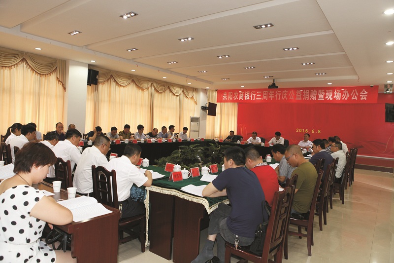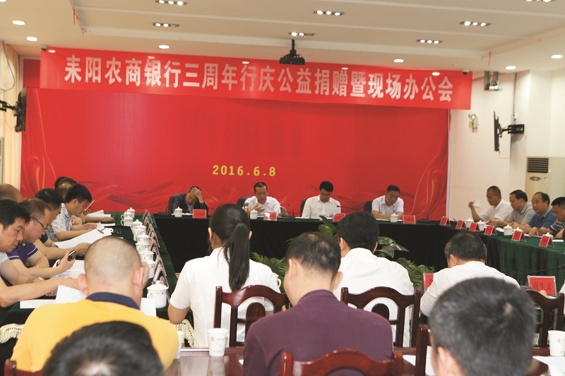 6月8日上午,为庆祝耒阳市成立30周年增光添彩,进一步提升耒阳农商银行的知名度,彰显企业品牌形象,耒阳农商银行三周年行庆公益捐赠仪式暨现场办公会在该行九楼大会议室隆重举行。耒阳市委书记彭玉明,市委副书记、市长刘革生,市委副书记李向阳,市委常委、常务副市长段晓赛,市委常委、市委办主任李云,市人大常委会副主任资雷,市人民政府副市长李兴武、江方敏,市政协党组副书记、正县级干部罗才国,市委办、市政府办、财政局等相关职能部门负责人应邀出席会议,耒阳农商银行班子成员、部门总经理(负责人)、股东代表等50余人参加了会议。
