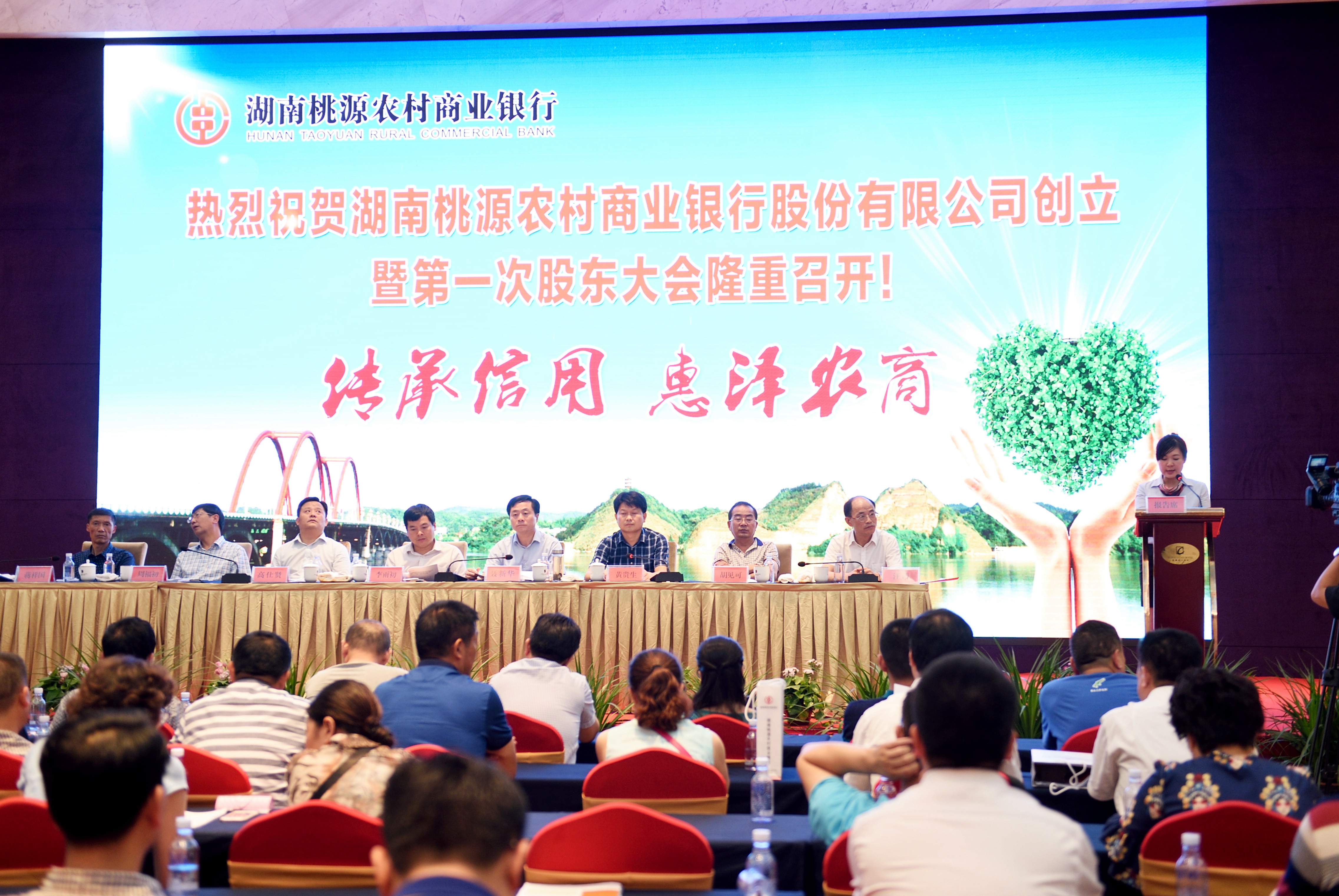 会议由桃源县委常委、副县长黄贵生主持,常德银监分局党委委员、副局长聂新华首先宣传了中国银监会湖南监管局《关于筹建湖南桃源农村商业银行股份有限公司的批复》,省联社常德办事处副主任高仕贤宣读省联社《关于同意湖南桃源农村商业银行股份有限公司董、监事候选人的批复》,桃源县委常委、纪委书记李雨初随后作重要讲话,对“桃源县农村信用合作联社”过去为服务三农、服务小微、服务经济所做的贡献给予了充分肯定,对“桃源农商银行”的正式创立表示热烈的祝贺,同时要求“桃源农商银行”要继续以服务地方经济为己任,传承信用,惠泽农商,致力于打造桃源人民满意的精品银行。