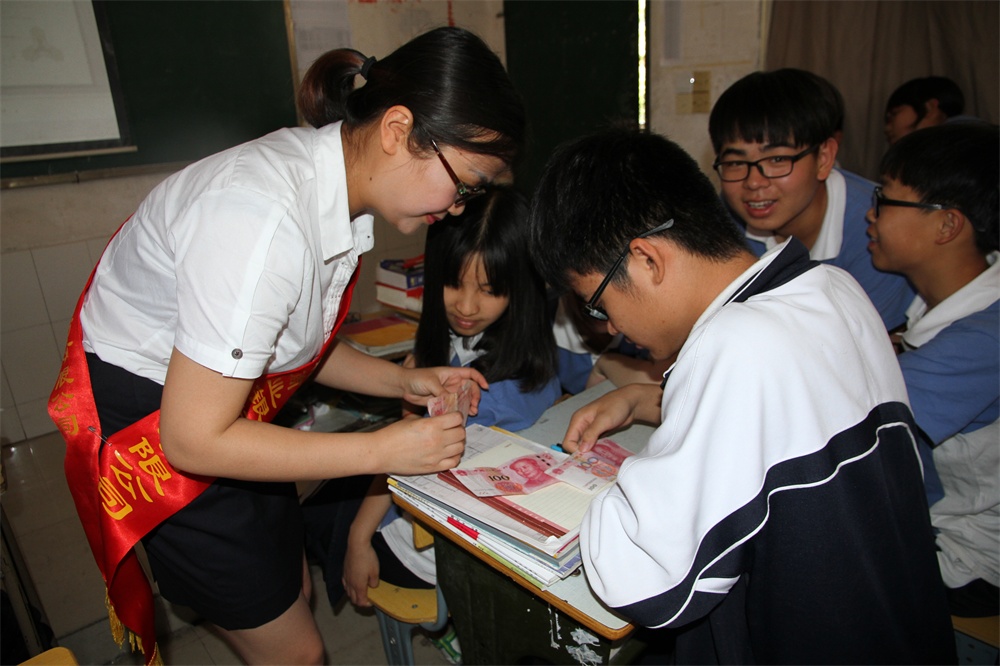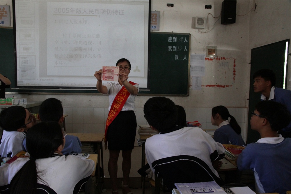 “如果同学们在一张人民币上发现粘贴痕迹,一定要仔细辨别痕迹两边的防伪标识,因为这有可能是假币中最具有迷惑性的拼凑币。”在石门县豫远中学的课堂上,石门农村商业银行工作人员正手把手教同学们辨别真假币。