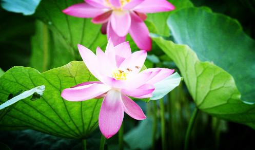 “妈妈,快看,小鸭子!”我正在荷塘边思绪飘飘之时,女儿清脆的叫喊把我的视线拉入水中,那儿的景象又别有一番情趣。一只母鸭领着几个幼崽穿行在茎叶丛中,畅快而灵巧地游来游去,显得温馨又惬意;细小的浮萍在水面上满满地铺展开来,仿佛一张浑然天成的绿毯,不需任何人工雕琢与后天修饰就能成形得完美无瑕、恰到好处。正当孩子懵懵懂懂想要抬腿贸然往前时,顽皮的青蛙忽地从荷叶上高高跃起,纵身一跳落入水中,伴随着“咕咚”的声响,绿毯裂出一条缝隙又迅速地合拢,水面上泛起一片涟漪,惊得孩子慌忙转身紧紧地将妈妈抱住;几条红皮小鱼时不时拨得水面“哗哗”作响,探头探脑的样子像是要透气和觅食,又像是在窃窃私语地彼此交流心声,若是剥一颗莲子扔入水中,它们却机敏地躲得无影无踪;低空盘旋的小蜻蜓飞累了,会一股脑儿在花瓣中央休憩,纤细的胳膊腿拥抱着散发淡淡清香的花蕊,痴迷地享受着沁人心脾的味道,好一副怡然自得的模样。也许我眼中的风景正如水墨丹青里表达的极致东方神韵,让人怦然心动之后回味无穷。