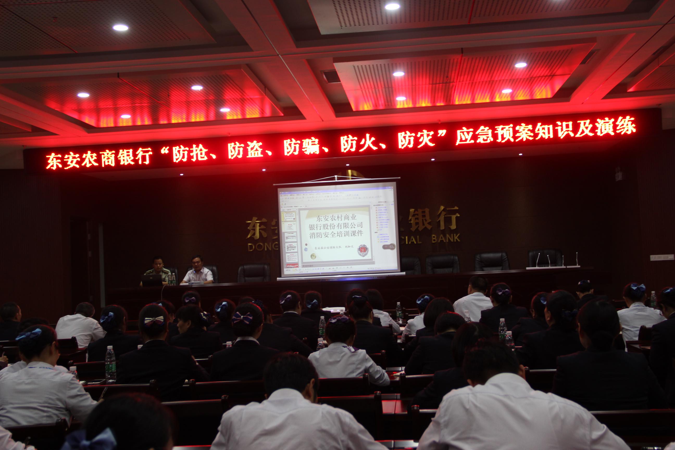 图为武警东安消防大队领导给东安农商行员工上消防知识辅导课