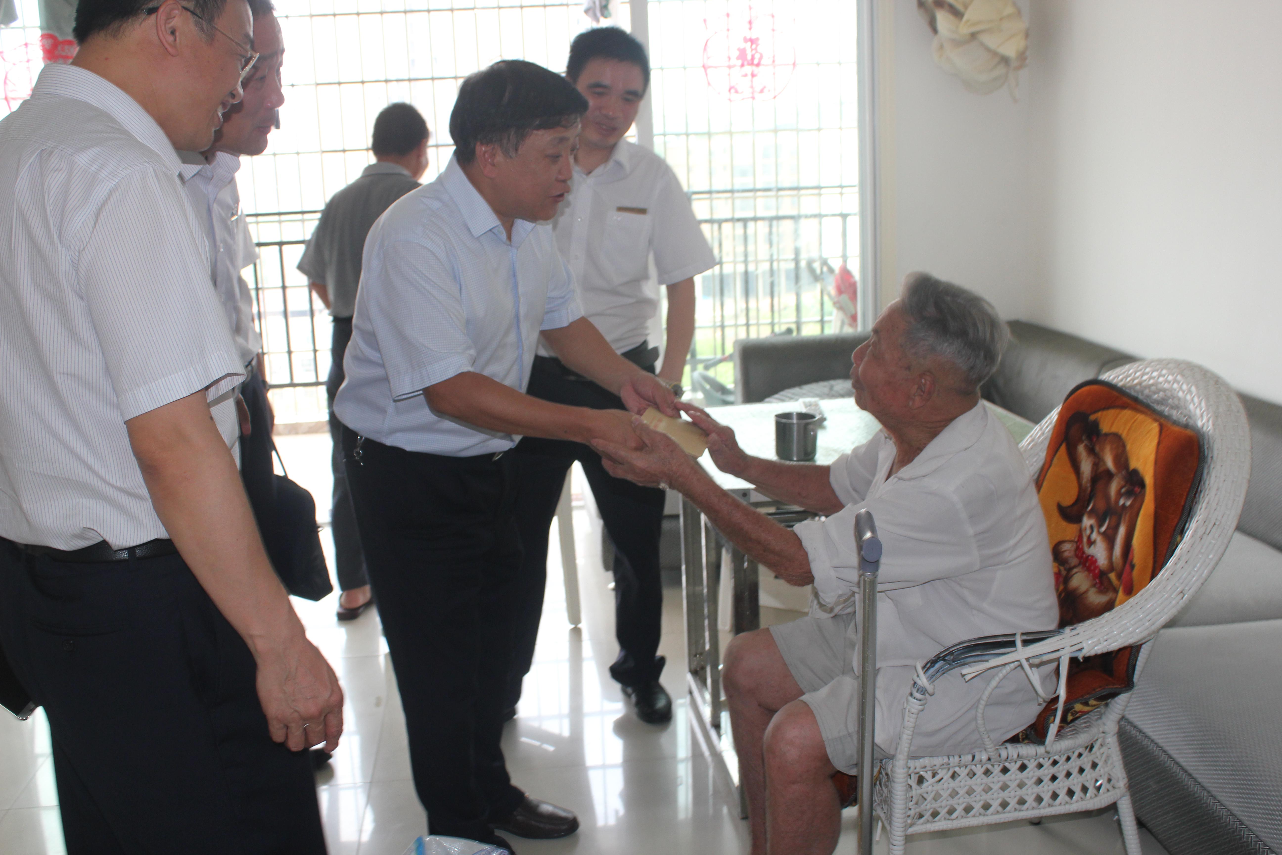 在看望了唐春生后,李中平一行又立马赶往白牙市镇苍头村,看望了已退休住在老家的93岁老党员唐义老人。一见面,李中平便上前亲热握住唐老的手说:“老同志,近来身体可好?”,并与他亲切交谈,详细询问他的生活情况和身体状况,并送上慰问品和慰问金。看到唐老身体健康、精神矍铄、晚年幸福,非常高兴,叮嘱他一定要保重身体,祝愿唐老健康长寿。唐义老人出生于1923年,1959年加入中国共产党,1964年参加工作即成为东安县第一代信合人,几十年如一日坚守在三尺柜台,默默贡献自己的青春和力量,为农信社的发展壮大做出了积极的贡献。道别时,李中平再次亲热握住唐老的手说:“有没有需要组织帮助的地方?,若以后需要组织关心、帮助的,你老尽管说,组织会热心地帮助您解决实际问题的”。