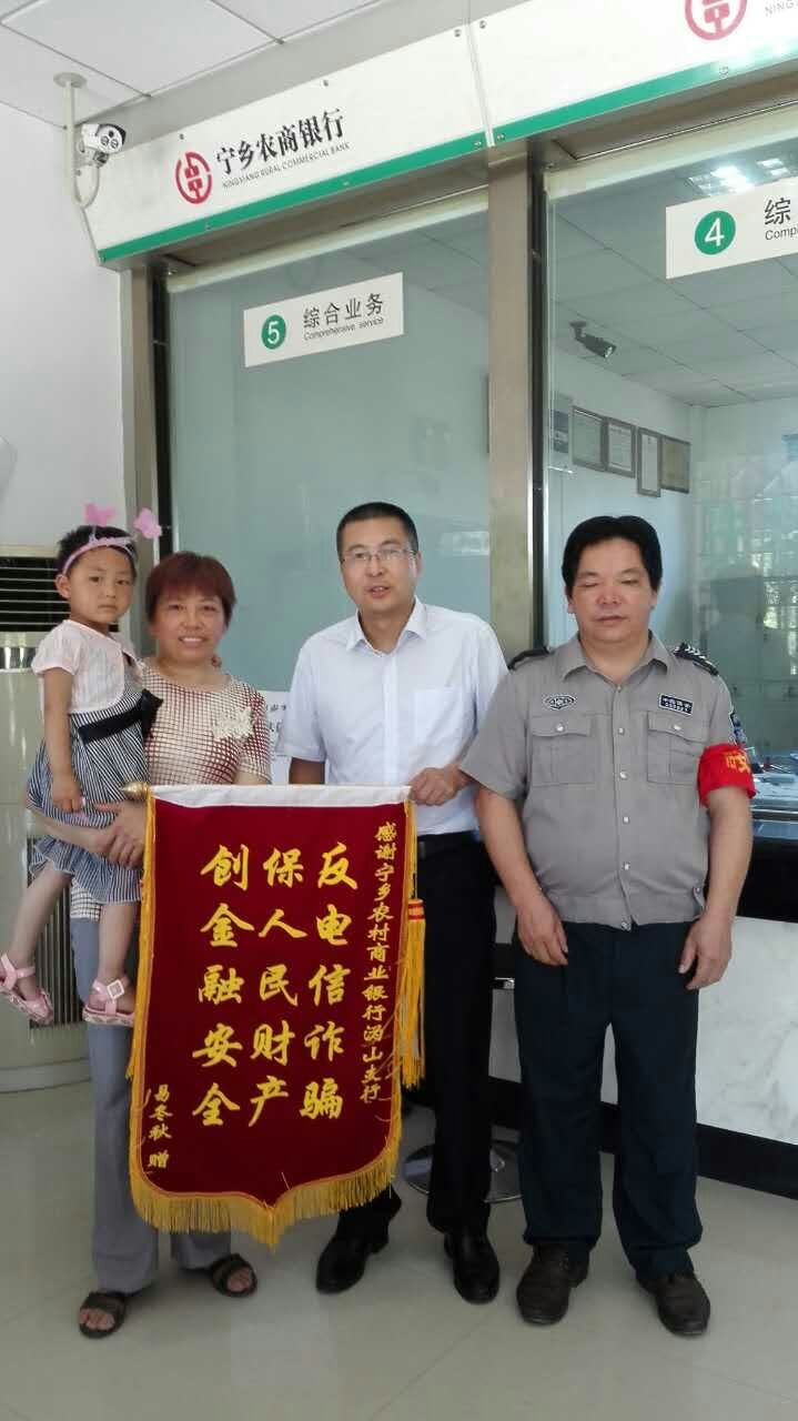 6月23日,沩山居民易某将精心准备的锦旗送到了宁乡农商银行沩山支行,感谢沩山支行工作人员及时提醒他识破电信诈骗!