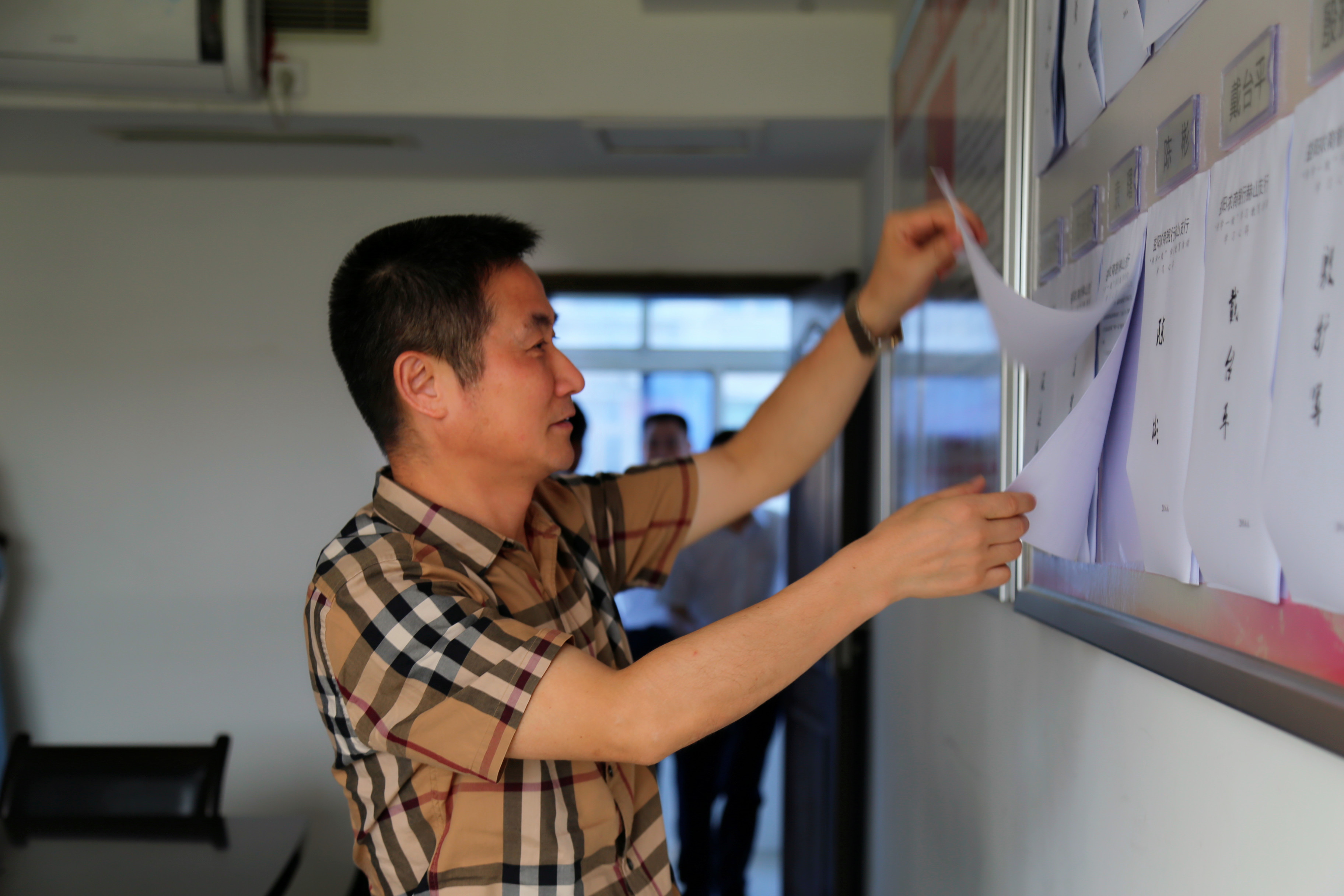 图为邓师辉在益阳农商银行赫山支行党员活动室仔细翻阅党员学习心得