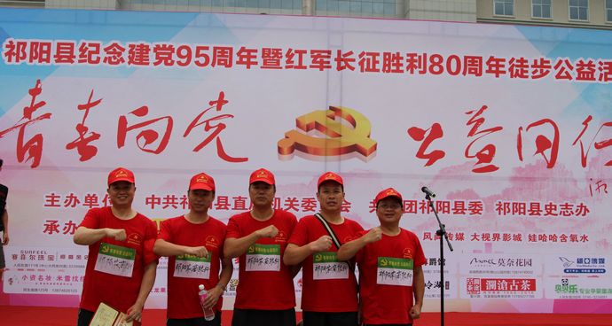 :今年是中国共产党成立95周年,也是纪念红军长征胜利80周年。为了回顾党的光辉历程,讴歌党的丰功伟绩,引导广大群众知党史、明党恩、当先锋,在全县范围内营造良好的庆祝氛围,特组织全县行政事业单位干部与社会各界人士用全民徙步的方式进行爱党爱国教育。本次活动由祁阳县直属机关党委、共青团祁阳县委、祁阳县史志办主办,祁阳县商海精英联盟承办。来自全县300多人参加了徙步活动,从县陶铸广场出发,经金盆路、白竹湖、民生路、盘龙路、往下马渡方向到达梅岭湖山庄,全程约7.5公里。农商银行员工胸佩行牌、手挥党旗、头顶太阳,冒着酷暑,奋力争先,仅用时70分钟到达了目的地,受到组委会和驻足观看群众的好评。充分体现了农商银行良好的精神风貌。