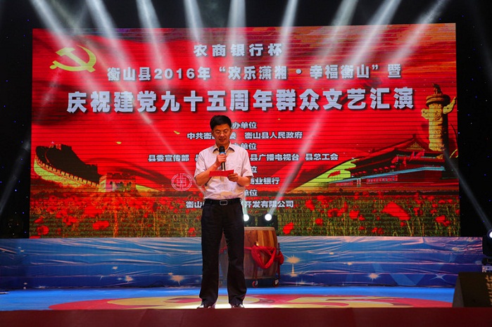 6月30日晚,由中共衡山县委、县政府主办,衡山农商银行冠名的“农商银行杯”2016年“欢乐潇湘·幸福衡山”暨庆祝建党95周年文艺汇演决赛在衡山剧院精彩上演。本次群众文艺汇演历时2个多月,经过各系统、各乡镇的初赛,共遴选出28支队伍,通过6月29日复赛的激烈角逐,17支代表队、400名选手晋级决赛。本次参赛节目的形式、内容、规模、影响力等方面都有了创新和提高,展示了衡山文化建设的丰硕成果,体现了衡山的人文魅力,彰显了衡山强大的人气凝聚,为庆祝建党95周年营造了浓厚的文化氛围。