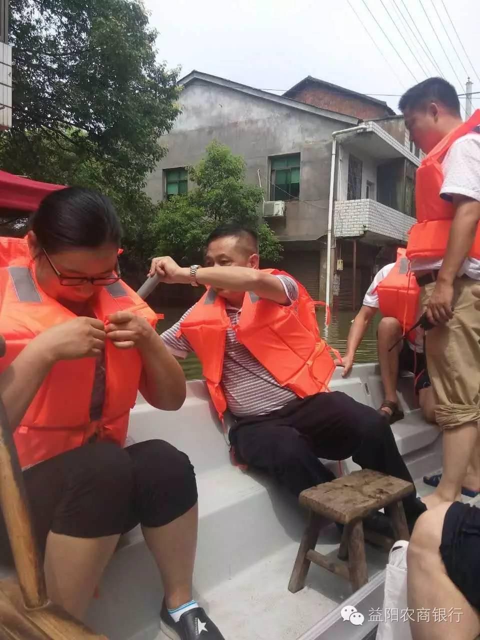 (图为泉交河支行刘阳权行长等人划船进入灾区查看灾情)
