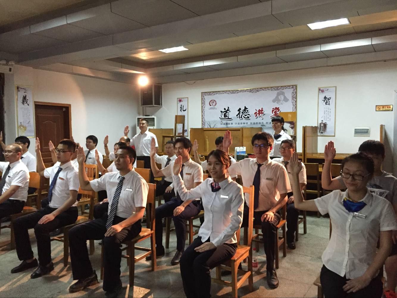 “您好!请坐!”“请问您需要办理什么业务?”……7月7日、8日晚,新田农商银行总行五楼会议室传来阵阵服务文明用语训练之声。会议室内,共计60余名员工参加了由新田农商银行内训师刘婷主讲的文明服务规范强化训练营。