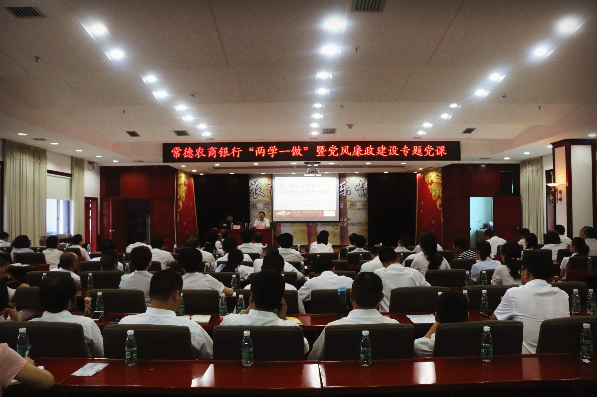 7月19日,根据“两学一做”学习教育计划,常德农商银行举办了“两学一做”第二专题“讲规矩 有纪律”暨党风廉政建设专题党课,邀请市纪委副书记李正才亲自授课,总行机关全体党员、一级支行班子及部门负责人,二级支行行长等共计145人现场学习,党课由总行党委书记、董事长陆化主持。