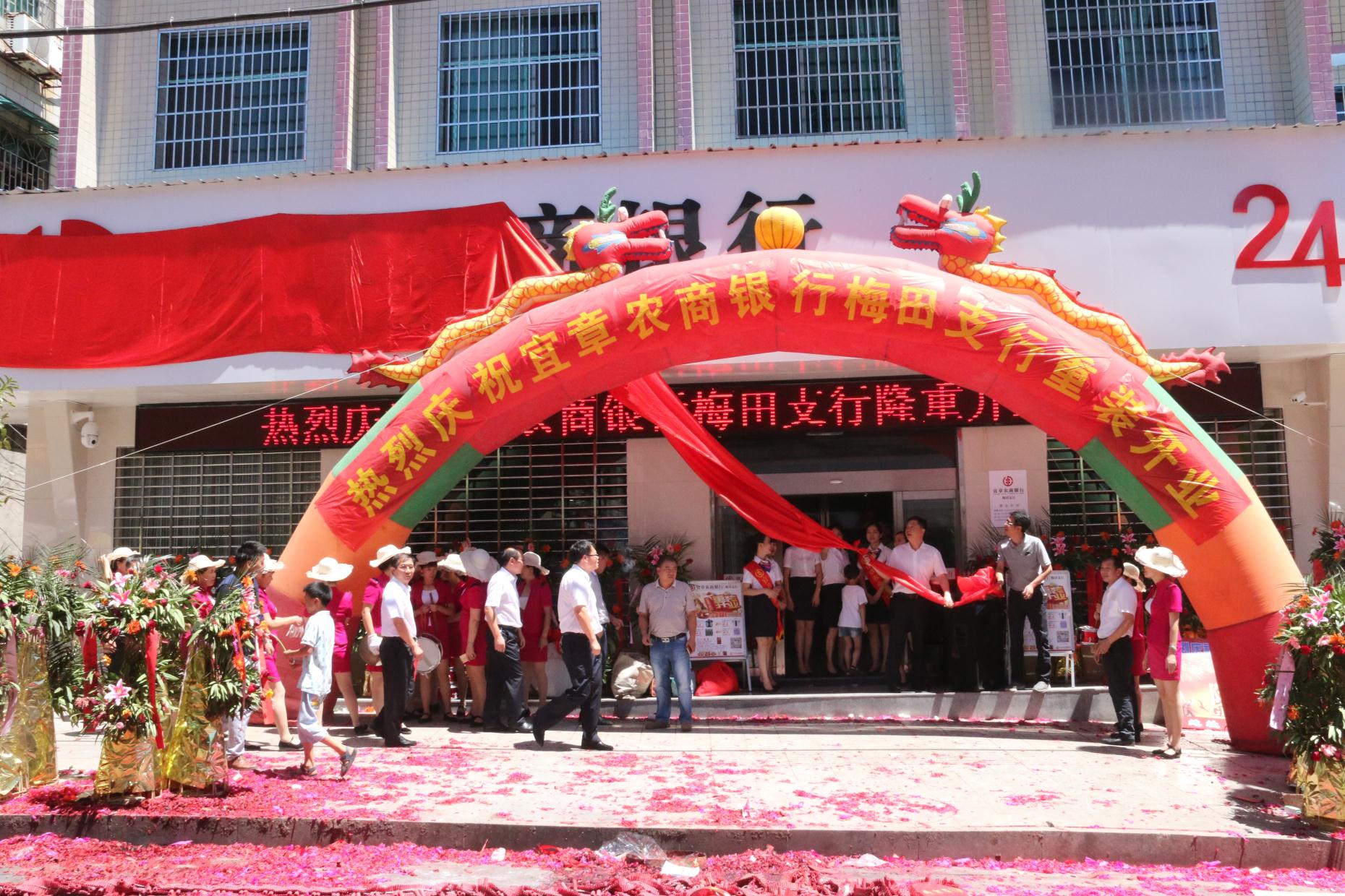 7月28日,宜章农商银行梅田支行重装开业。梅田镇党委书记贺龙跃出席开业庆典,与宜章农商银行董事长郑兴国共同为梅田支行揭牌。
