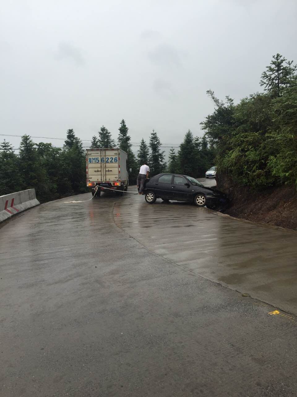 “勾挂岭山势险峻,盘山公路道路狭窄,我们担心双向来车稍有不慎,造成二次车祸。”在仔细观察了车况、路况和地形之后,谭春华决定三人分工合作:由谭春华、廖迎亚分别在道路两侧来车方向维持交通秩序,提醒过往车辆暂停通行;司机雷晓明利用所开的工具车和拖绳对被困车辆进行拖拽。