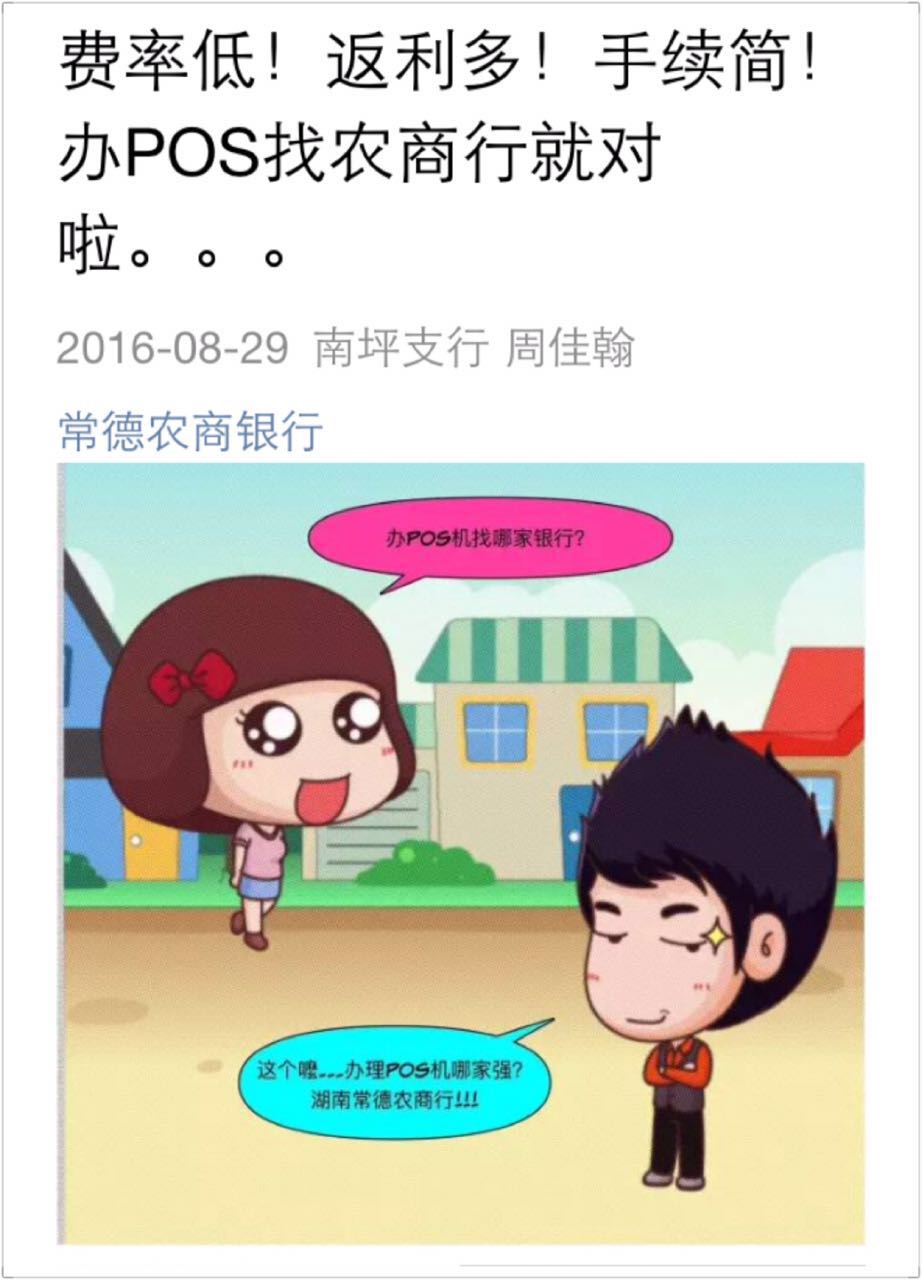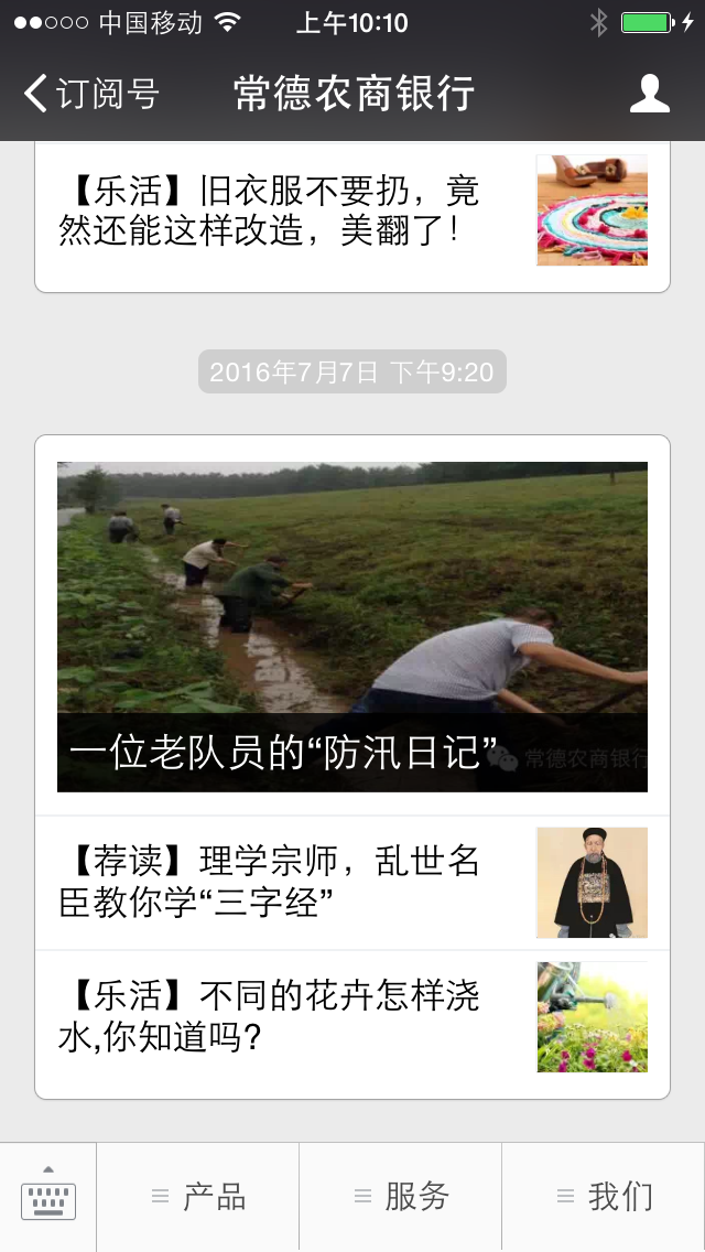 从“2016年湖南高考分数线公布”到“奥运会完整赛事指南”,贷款户邓先生一家子微信点击不停歇。邓先生是农商行的老信贷客户,经客户经理推荐,从6月份开始关注常德农商行微信公众号。女儿恰好今年高考,儿子是个“奥运迷”,看到《2016年湖南高考分数线公布》和《奥运会完整赛事指南》两条信息后,他们一家子立马就爱上了便民、实用的农商行微信公众号。他们通过查看历史消息,了解到农商行电子银行产品收费优惠政策,根据女儿上大学的实际情况,在农商行网点办理一张福祥IC卡并开通转账全免费的手机银行。现在全家人都关注农商行信息推送,邓先生喜欢“最新产品介绍”,妻子热衷“养生保健”、“美食分享”,儿子关注“时事热点”、女儿偏爱“美文分享”,同时顺便关注农商行新业务,了解到“反假币”、“防诈骗”、“打击非法集资”等金融安全常识。为表达“微粉”的忠诚,他们还通过朋友圈和微信群转发信息,并对菜单设计提出了很好的建议,希望农商行微信越来越“接地气”。微信公众号日益成为农商行与客户不断深入交流、“黏”接的纽带,客户在这里不仅仅能获得专业的金融知识,更能从其他丰富多彩的栏目中感受这家 “常德人自己的银行”全方位的深情陪伴。