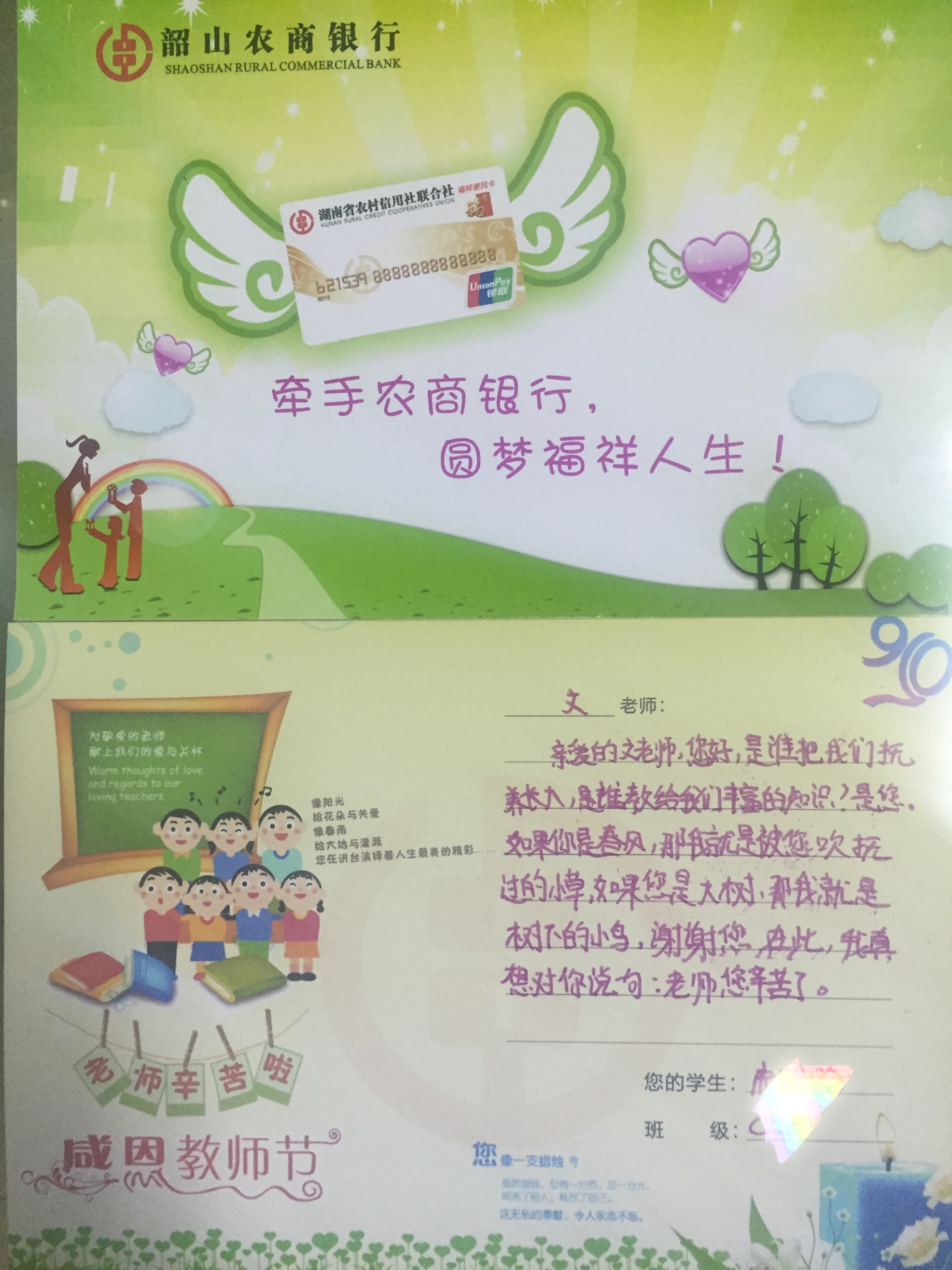 宣传活动中,该行以“感恩亲爱的老师,我为老师送祝福”为主题的互动活动同步进行。通过将定制的教师节贺卡分发给同学们,让他们用彩笔写下想对老师想说的话,增进师生之间的情感交流。而此次收集到的这些贺卡也将在教师节由该行统一送到老师的手中,送上孩子们对老师的真挚祝福。活动现场人来人往、络绎不绝,在了解该行宣传金融知识的同时,纷纷对互动活动的形式点赞。