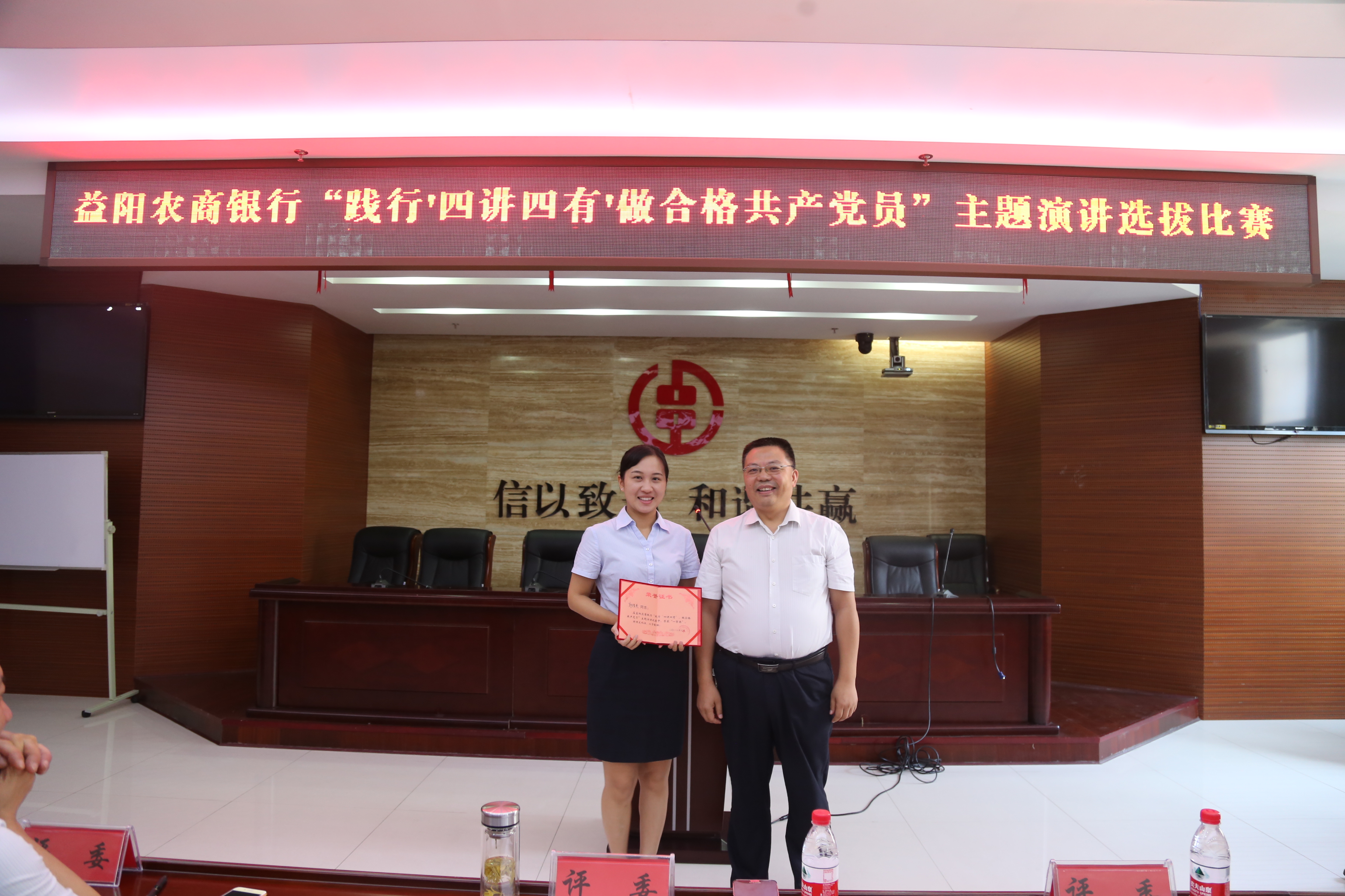 日前,益阳农商银行在总行二楼会议室举办“践行‘四讲四有’做合格共产党员” 主题演讲选拔比赛,旨在进一步落实省联社及益阳办事处相关工作要求,扎实推进全行“两学一做”学习教育,营造做“四讲四有”合格共产党员的浓厚氛围,同时从中选拔两名优秀选手参加办事处组织的演讲比赛。