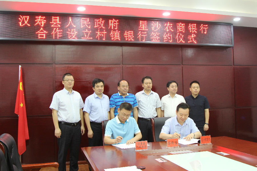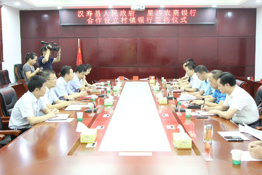 2016年9月19日,汉寿县委、县政府在政府常务会议室举行隆重的签约仪式,星沙农商银行王进董事长与汉寿县委副书记、代县长车世忠作为双方代表,就在汉寿发起设立村镇银行正式签订战略合作协议。这是我行继发起设立的华容星龙村镇银行顺利挂牌开业、新化村镇银行筹建工作紧密推进之后,对外投资发展、推进村镇银行战略部署的“第三站”。