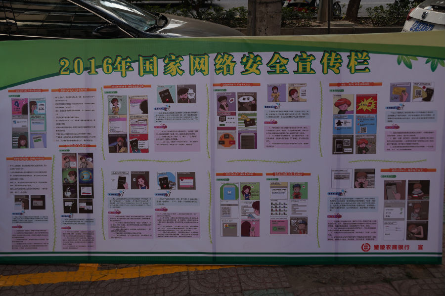 我行对此次活动高度重视,由分管科技、宣传工作的领导牵头,办公室、科技部门和相关业务部门共同参与,积极组织开展网络安全宣传活动。活动期间,悬挂宣传横幅48条,制作宣传展板50块,共印刷《金融网络安全知识手册》等宣传资料五千多份,辖内46个网点同步参与发放宣传。活动现场,重点普及安全使用银行卡、防诈骗、保护个人敏感信息和金融机构网络安全保障等知识,并就群众咨询的问题一一进行了解答。所有网点电子显示屏滚动播放“筑牢网络安全基石,成就网络强国梦想”、“树立支付安全意识,推进和谐金融建设”宣传标语。有广告机的网点,不间断循环播放银行网络安全宣传视频。