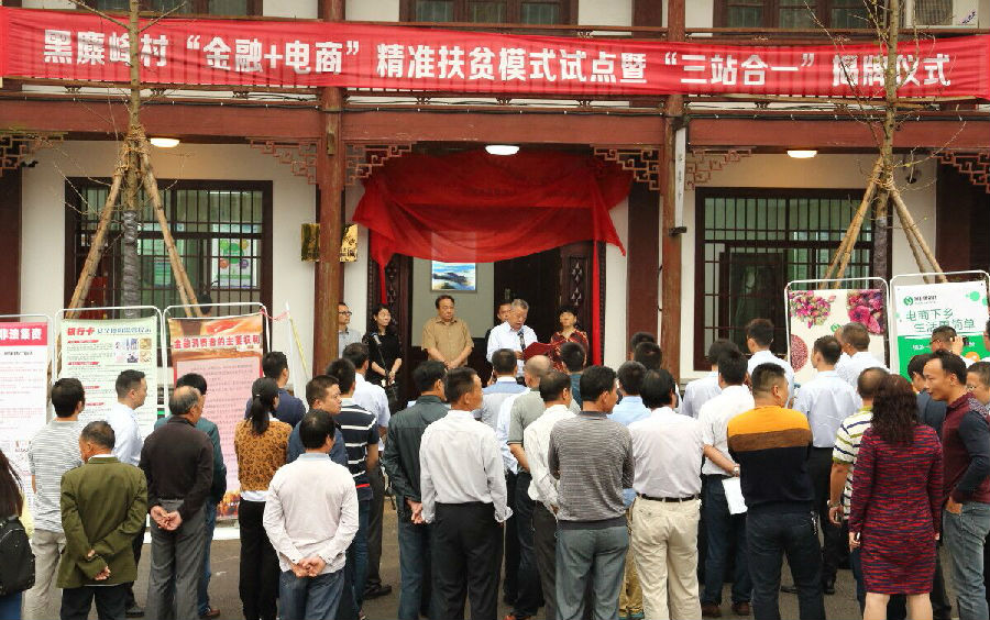 9月28日,长沙市望城区举行了桥驿镇黑麋峰村“金融+电商”精准扶贫模式试点暨金融扶贫服务站、雷锋式电商服务站、村级事务服务站“三站合一”揭牌仪式。人民银行长沙中心支行副行长徐涌、长沙市国资委正处级调研员陈浩清、望城区副区长刘洪波、人民银行长沙中支科技处处长易善昌、货币信贷处副处长钟文德、支付结算处副处长周进、长沙商务局电子商务处处长袁芳等领导,望城区扶贫办、金融办、商务局、人民银行望城支行等单位负责人及黑麋峰村支两委、驻村工作队和村民代表,新华社、长沙电视台、长沙晚报、望城电视台等10余家新闻媒体参加了揭牌仪式。