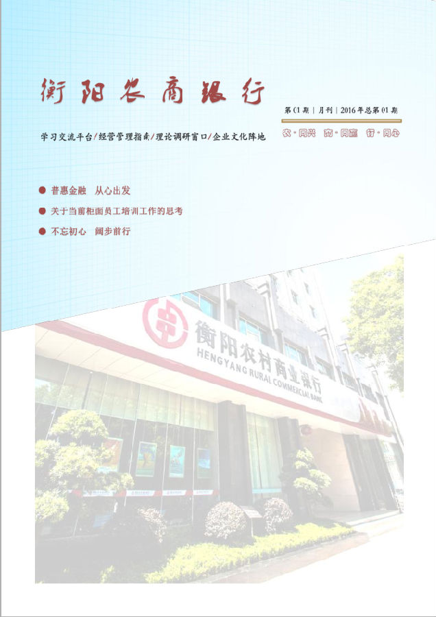 “全新出发,真情相伴”是《衡阳农商银行》第一期的主题,本期内刊设置了卷首、经验交流、行内动态、理论调研、员工家园和精彩回放六个栏目,精选的大部分文章都围绕着庆祝衡阳农商银行开业为主线,充分展现了我行员工在改革筹建工作期间爱岗敬业、团结一致、乐于奉献及和谐快乐的可贵精神。