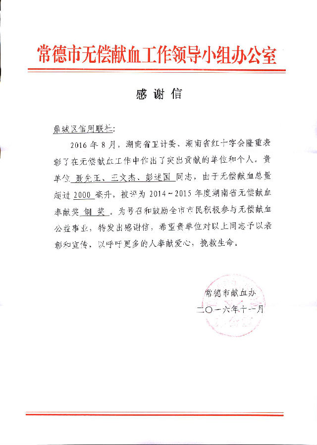 为弘扬社会主义核心价值观,不断提高广大党员干部践行“两学一做”学习教育的自觉性,常德农商行鼎城支行积极响应号召,动员辖内员工参加无偿献血活动。今年来,累计无偿献血24人次,8200 cc。特别是聂先正、王文杰、彭述国同志,由于无偿献血总量超过2000毫升,被湖南省卫计委、湖南省红十字会评为2014-2015年度湖南省无偿献血奉献奖铜奖,他们用实际行动为血液病患者送上了生命的延续,为国家红十字事业做出了贡献。