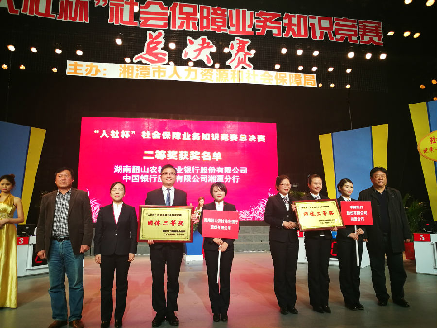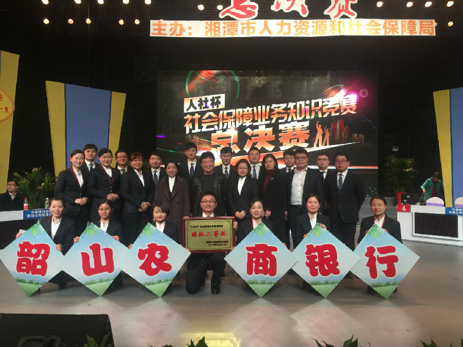 12月16日,由湘潭市人力资源和社会保障局主办的“人社杯”社保业务知识竞赛总决赛在湘潭电视台演播厅隆重举行。湘潭市12家社保卡合作银行全部参赛,韶山农商银行三名选手认真听题、冷静分析、沉着答题,通过两轮激烈比拼,最终脱颖而出,喜获“团体二等奖”的好成绩,向全湘潭人民展示了农信人的风采。