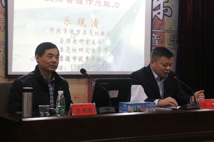 会议首先邀请中共常德市委党校管理学教授、管理教研室主任、省委党校研究生导师乐观清同志授课,乐教授围绕“讲奉献 有作为”这一主题,以“修炼‘三商’奉献素养,提高管理作为能力”为切入点,深入浅出的讲解了如何通过修炼“智商、情商、胆商”来培养奉献精神,以及如何理解管理的意义、掌握管理的智慧、提升管理作为能力。