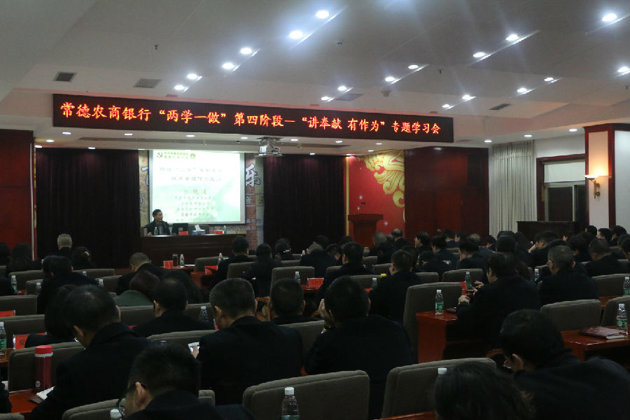 12月20日晚7点,常德农商银行召开“两学一做”第四阶段-“讲奉献 有作为”专题学习会。总行班子成员、部门负责人、机关全体党员;一级支行班子成员、部门负责人;直属支行行长、二级支行行长等150人参加会议。会议由总行党委书记、董事长陆化同志主持。