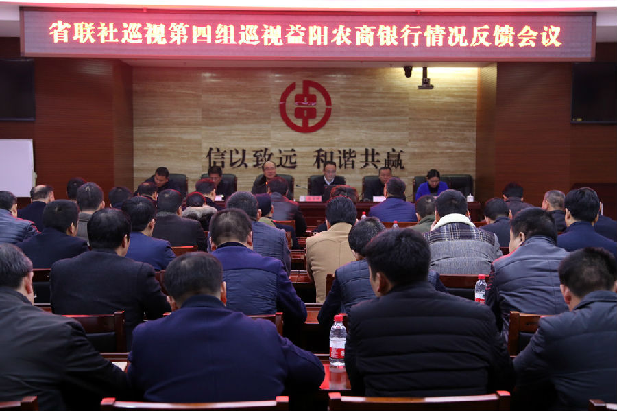 12月21日上午,省联社党委第四巡察组反馈意见会议在益阳农商银行总行二楼会议室召开,巡察组成员、益阳办事处徐晓朋科长及我行行领导、正副协理员、部室经理、支行行长共计60人参加会议。会上,省联社第四巡察组组长易萍萍反通报了巡视情况并对整改工作提出相应要求,益阳农商银行党委书记、董事长马勇辉主持会议并作了表态发言。