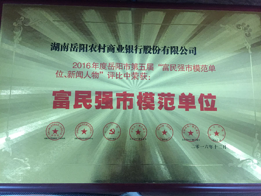 1月22日,从岳阳市2016年度“富民强市模范单位、经济新闻人物”颁奖典礼上传来喜讯,岳阳农商银行荣获全市富民强市模范单位。