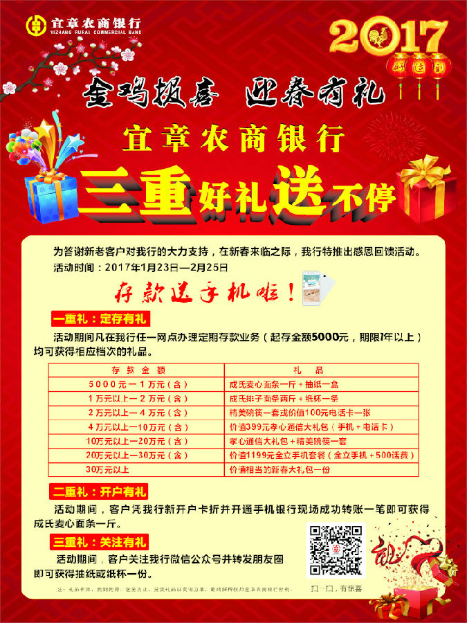 创新主题,聚集人气。全行以亲情孝心作为营销活动的切入点,推出“存款农商行,手机免费拿,把它送父母,孝心带回家”的情感营销口号,活动从1月23日开始,对办理1年以上定期存款业务、开户卡折并开通手机银行成功转账、关注微信公众号并转发朋友圈的客户,赠送精美礼品。通过张贴海报、LED屏播放宣传标语、微信PPT等方式,形成持续的市场推广攻势,吸引了客户关注,聚集了客户人气,以营销活动带动了存款业务拓展。