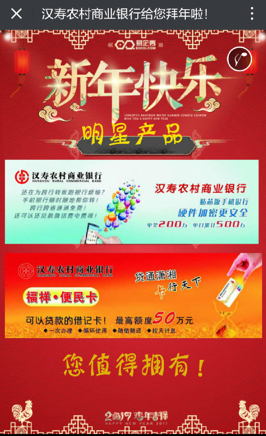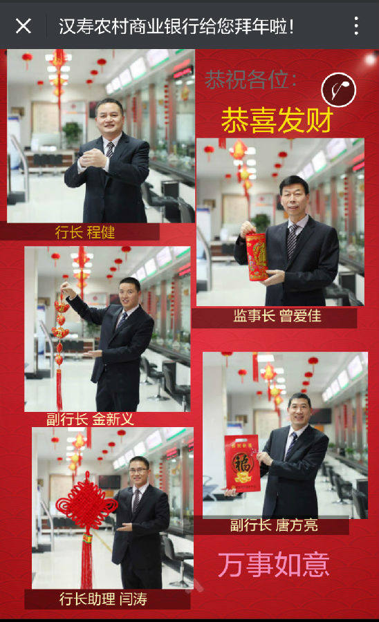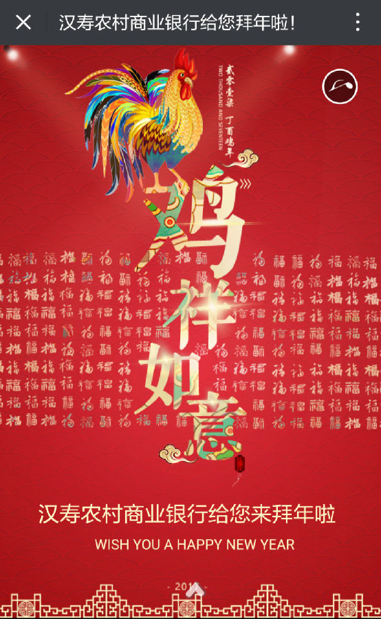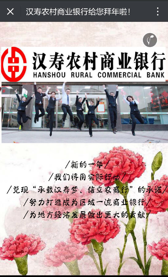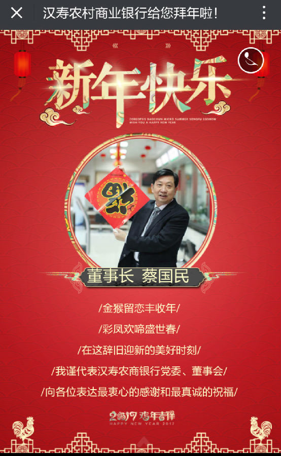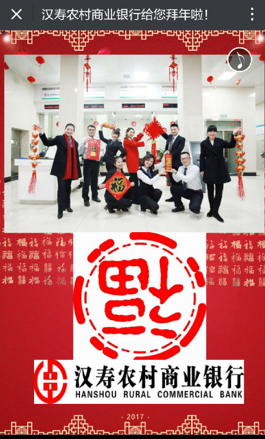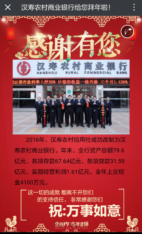 “金猴留恋丰收年,彩凤欢啼盛世春。在这辞旧迎新的美好时刻,汉寿农商银行给您拜年啦!祝您鸡年吉祥,万事如意……”正值新春佳节,一份由汉寿农商银行精心制作的“音乐贺卡”在朋友圈被大量转发、点赞,第一时间为广大员工、股东、客户等送去了新春的祝福。