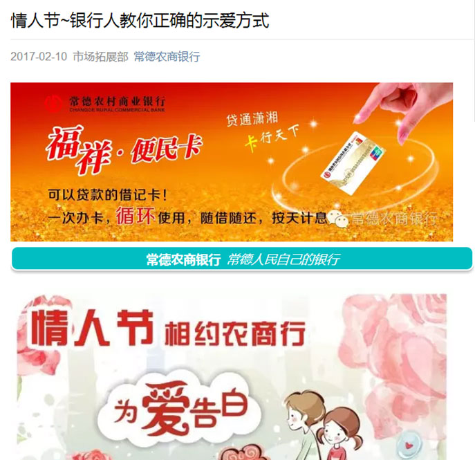 情人节将至,常德农商银行巧用“互联网思维”,借势大打甜蜜牌,推出了充满寓意的“爱情存单”,巧用谐音数、大声说爱你,并通过微信公众号广为传播,浪漫、新颖的业务模式立刻吸引了不少年轻人的关注。