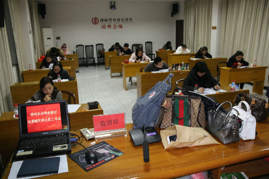 为科学合理调配城区网点岗位人员,靖州农商银行通过制定了《靖州农商银行2017年选调城区网点员工的方案》,于2月15日晚,在总行四楼会议室组织进行了公开选调考试。来自乡镇支行的15名符合条件的员工参加了本次考试。
