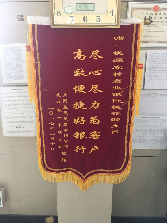 “多亏了你们农商行,我们工地两百多个工人工资才这么快就拿到手,帮我解决了大难题。在你们这里办理业务,不仅服务好,效率也是特别的高,今天特意给你们行送来锦旗,以表感谢,”。某建筑公司项目负责人陈老板赞扬的说到。