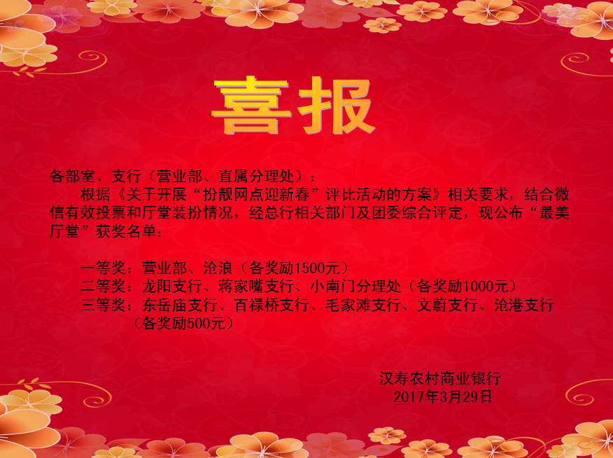 2017年1月份以来,该行在全行范围内开展“扮靓网点迎新春”活动。1月18日,经过初步筛选,30家支行正式“登录”该行微信公众号,“最美厅堂”网络评选通道正式开启。
