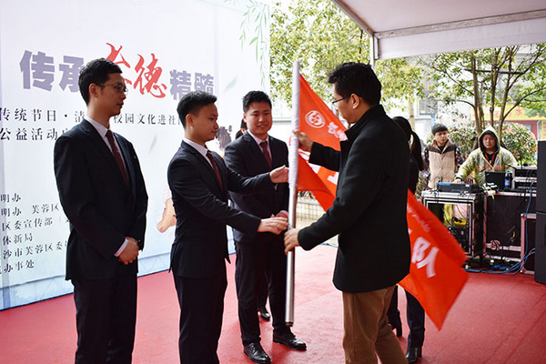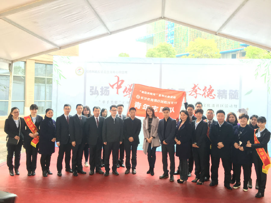 3月30日,长沙农商银行与共青团长沙市芙蓉区委员会联合策划的“爱在浏阳河”系列公益活动启动仪式在东岸街道东宜社区举行。湖南省文明办未成年人工作处处长史锋为浏阳河支行青年志愿队授旗,标志着“爱在浏阳河”系列公益活动正式拉开序幕,今后服务队将与街道社区一起,帮扶特殊群体,帮解居民难题。