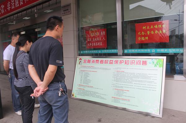今年来,雨湖联社成立了金融消费者权益工作小组,开展了一系列具体的宣传工作。在营业网点悬挂公示牌、宣传横幅,利用宣传展板在各网点流动宣传金融消费者拥有的权利、金融机构应尽的义务以及消费者的维权途径等金融知识,受到广大客户的一致好评。