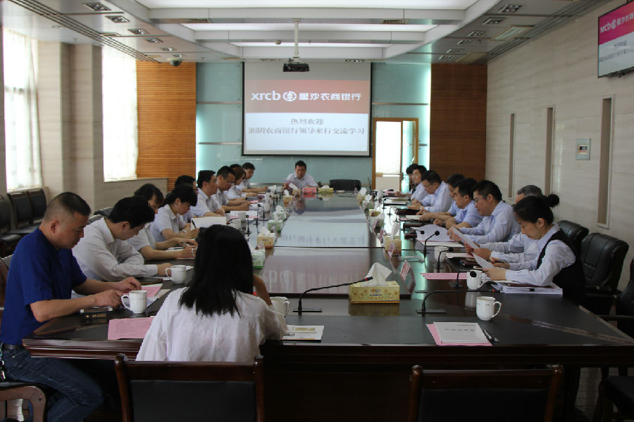 湘阴农商银行李进董事长简要介绍了湘阴农商银行相关情况,表达了此次来该行考察主要目的,即就绩效考核、信贷管理、风险管理、客户拓展、内控案防等方面进行交流学习。总行何伟行长对湘阴农商银行领导的到来表示热烈欢迎,详细介绍了该行的基本情况、业务发展的新举措、在内部管理、信贷产品和电子银行业务方面的创新以及队伍建设、内控案防等方面的重点工作情况。