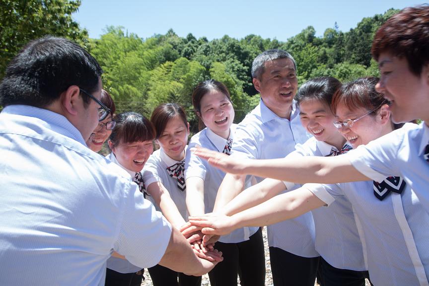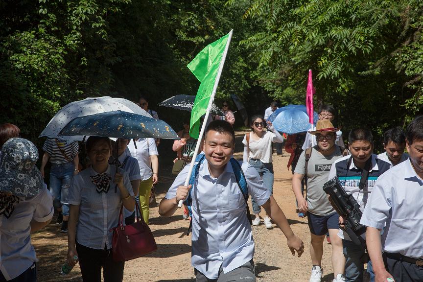 青山绿水,轻松相伴。一路上,一幅幅美好的画面在眼前铺开:你走不动了,我等你,陪你一起走;你渴了,我包里有水,帮你拧开……就这样相互扶持,全体员工一个不落,到达山顶。