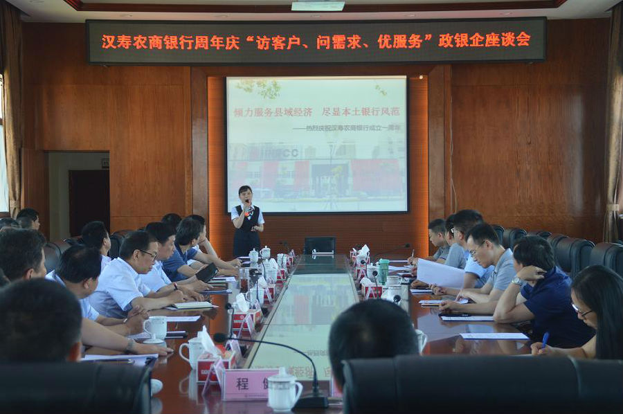 5月26日,汉寿农商银行周年庆“访客户、问需求、优服务”政银企座谈会在该行七楼会议室召开。汉寿县委常委、统战部部长李裕军,县委常委、县人民政府副县长蔡武,县人民政府副县长李碧波出席会议,县财政局、科技工信局、商务粮食局、金融办、人民银行汉寿支行主要负责人,县域22家企业法定代表人,农商银行全体班子成员、中层骨干代表等近50人参加座谈。