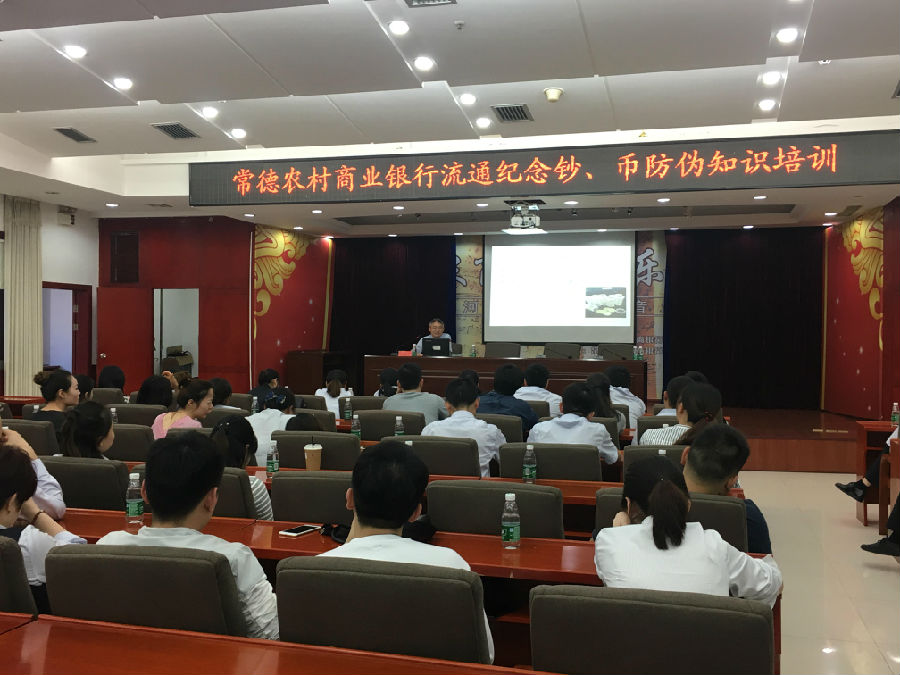 6月6日晚7点,常德农商银行在总行八楼开展了“流通纪念钞、币防伪”知识培训。本次培训特邀人民银行货币金融科三人组成讲师团,为该行员工进行专业授课。各支行委派会计、分理处负责人共80余人参加了培训。