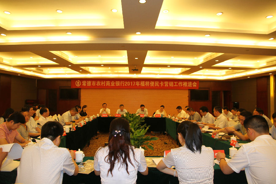 6月16日上午,常德市农村商业银行2017年福祥便民卡营销工作推进会在石门县国际大酒店召开。办事处党组成员、副主任胡三立,办事处业务指导科、综合科、资产管理中心负责人,各法人行行长、分管副行长、业务部门及办公室负责人、基层支行行长代表共计50余人参加会议。会议由办事处业务指导科科长田祖锋主持。