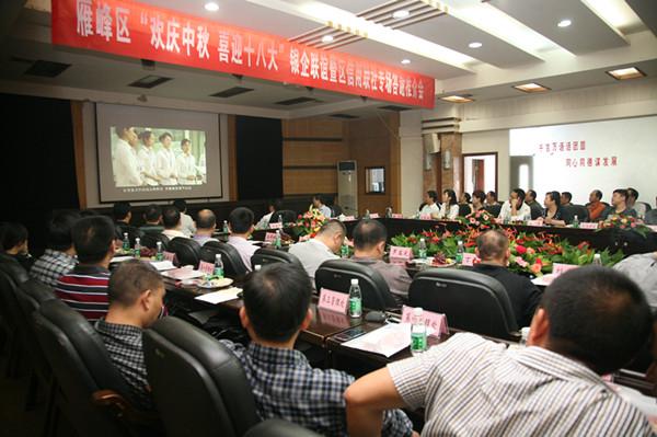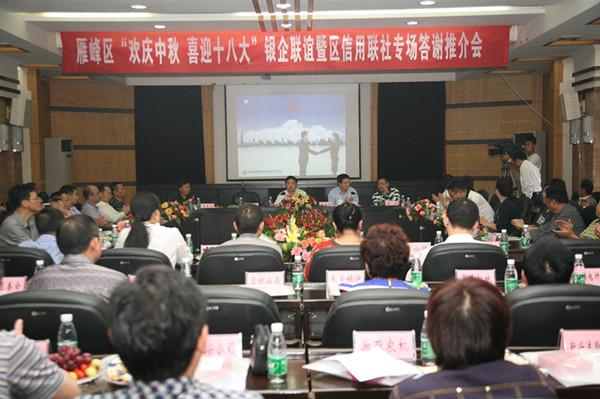 9月25日上午,衡阳市雁峰区委、区政府在区政府会议室隆重举办“欢庆中秋、喜迎十八大”银企联谊暨区信用联社专场答谢推介会。雁峰区委书记、区政府区长、常务副区长、常委副区长等领导及辖内乡镇街道书记、村书记、重要客户代表等80余人参加了会议。区长周建主持座谈会,副区长李军作了主题报告,区委书记唐学石作重要讲话。