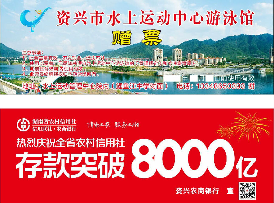 5.场馆联合宣传。资兴农商银行与资兴市水上运动中心进行合作,一是在运动中心游泳馆墙面张贴巨幅宣传海报;二是通过赞助赠送游泳票形式,在所有增票上印刷庆祝全省农村信用社存款突破8000亿内容。