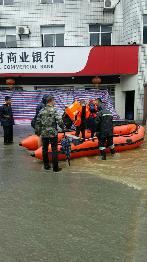 洪水突袭,紧急驰援。7月1日凌晨,在暴雨的持续冲击下,郭镇乡水位不断上升,上游路段已经淹没,洪水急速冲向下游的临街门面和民房,而郭镇支行网点正处在地势最低的地段且背靠黄梅港,严重遭受到洪水的冲刷,由于郭镇支行营业网点受强降雨遇险,郭镇支行全体员工闻讯后从四面八方赶来迅速奔赴支行网点。