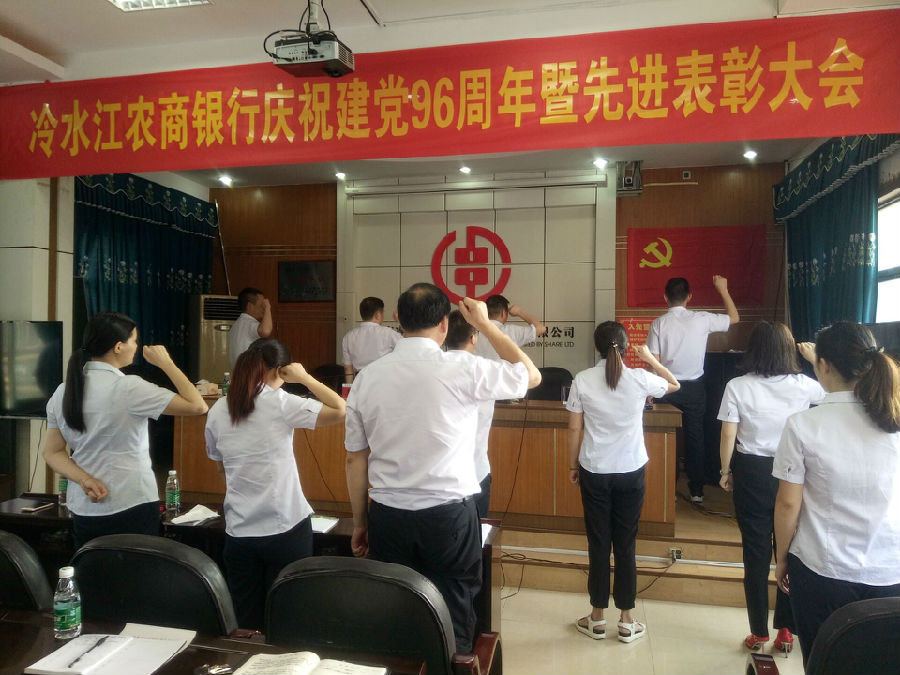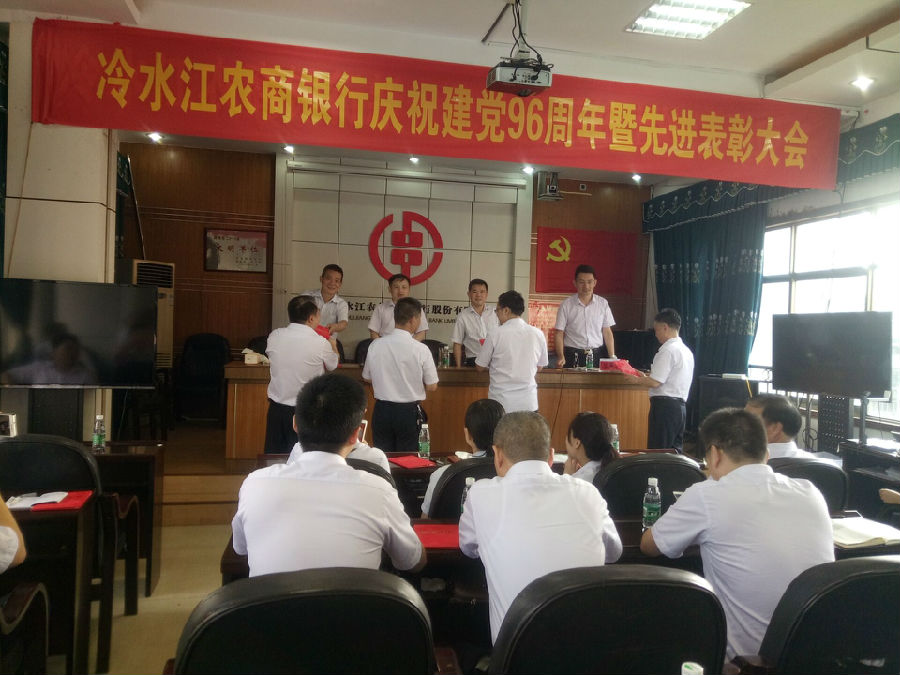 7月3日,冷水江农商银行召开庆祝建党96周年暨先进表彰大会,热烈庆祝中国共产党成立96周年,隆重表彰在全行各项经营管理工作中涌现出来的优秀党员。行党委班子成员、各党支部书记、机关部室经理、先进党员代表、新党员等40余人参加会议。